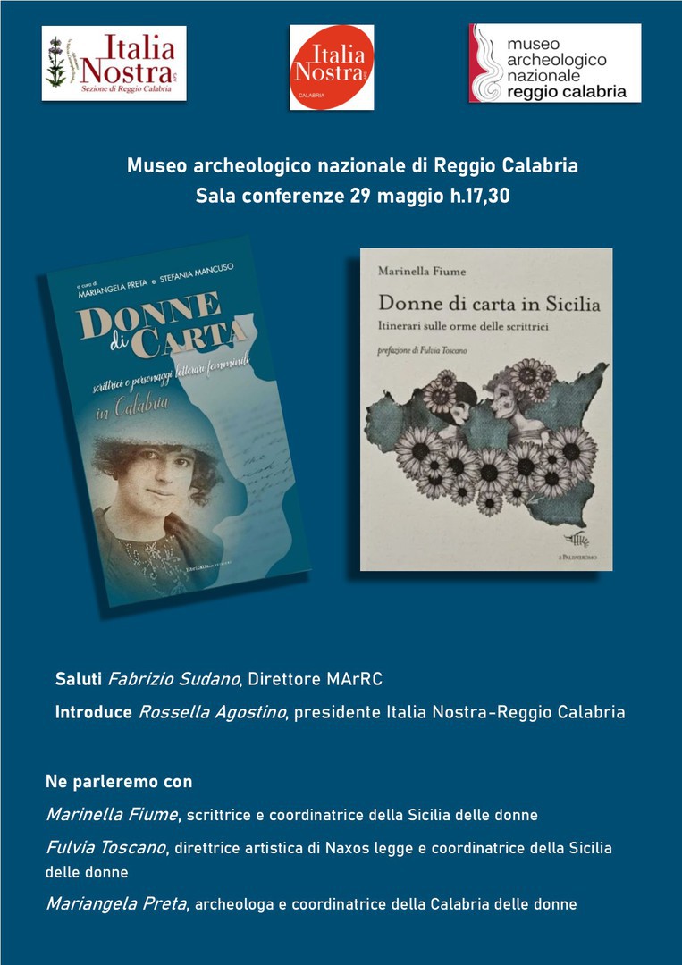 I volumi "Donne di Carta scrittrici e personaggi letterari femminili in Calabria" ( M.Preta e S.Mancuso) e "Donne di carta in Sicilia. Itinerari sulle orme delle scrittrici" (M.Fiume) pubblicati nell'ambito delle attività dell'Associazione Donne di Carta fondata nel 2008, che ha come obbiettivo la promozione della lettura finalizzata anche alla conoscenza del bene culturale, hanno permesso di ricordare quante figure femminili tra ottocento e novecento si sono impegnate in vari campi dando prova di forza, tenacia nella società del loro tempo. E' stata anche un'occasione per ricordare le figure femminili legate alla storia di Italia Nostra come Elena Croce scrittrice ed ambientalista o Desideria Pasolini dell'Onda, storica dell'arte e traduttrice italiana. La conversazione si è tenuta al Museo archeologico nazionale il 27 maggio 2025